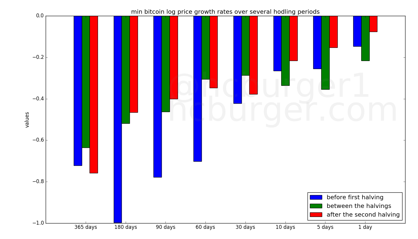 The value of the minimum growth rate over several hodling periods also tends to decrease over the three halving periods, though this effect is less marked than for the maximum growth rate.