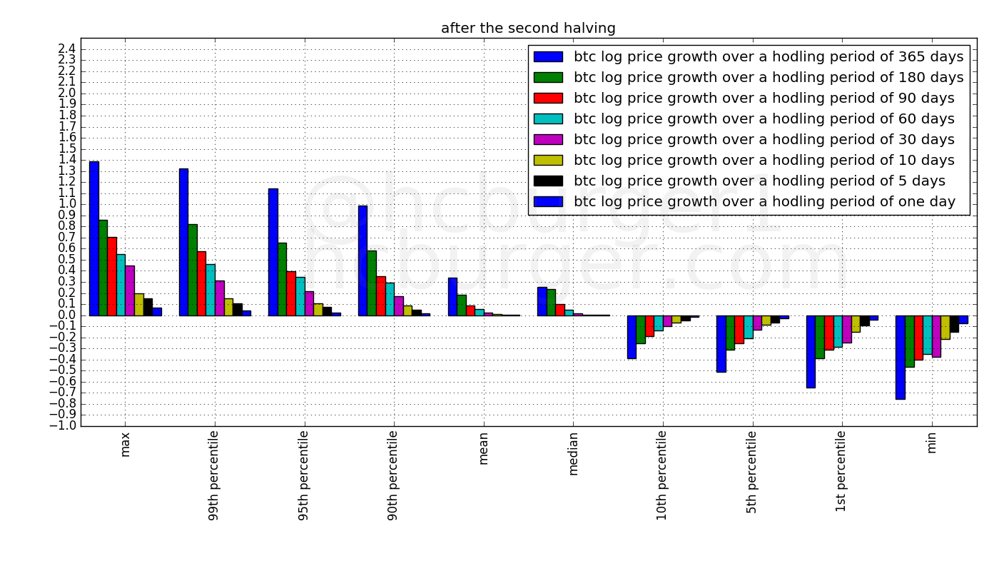 The next plot displays the statistics for the second halving period. The y-axis still uses the same scale. The fact that almost all bars have shorter length means that the statistics over most hodling periods have been attenuated.