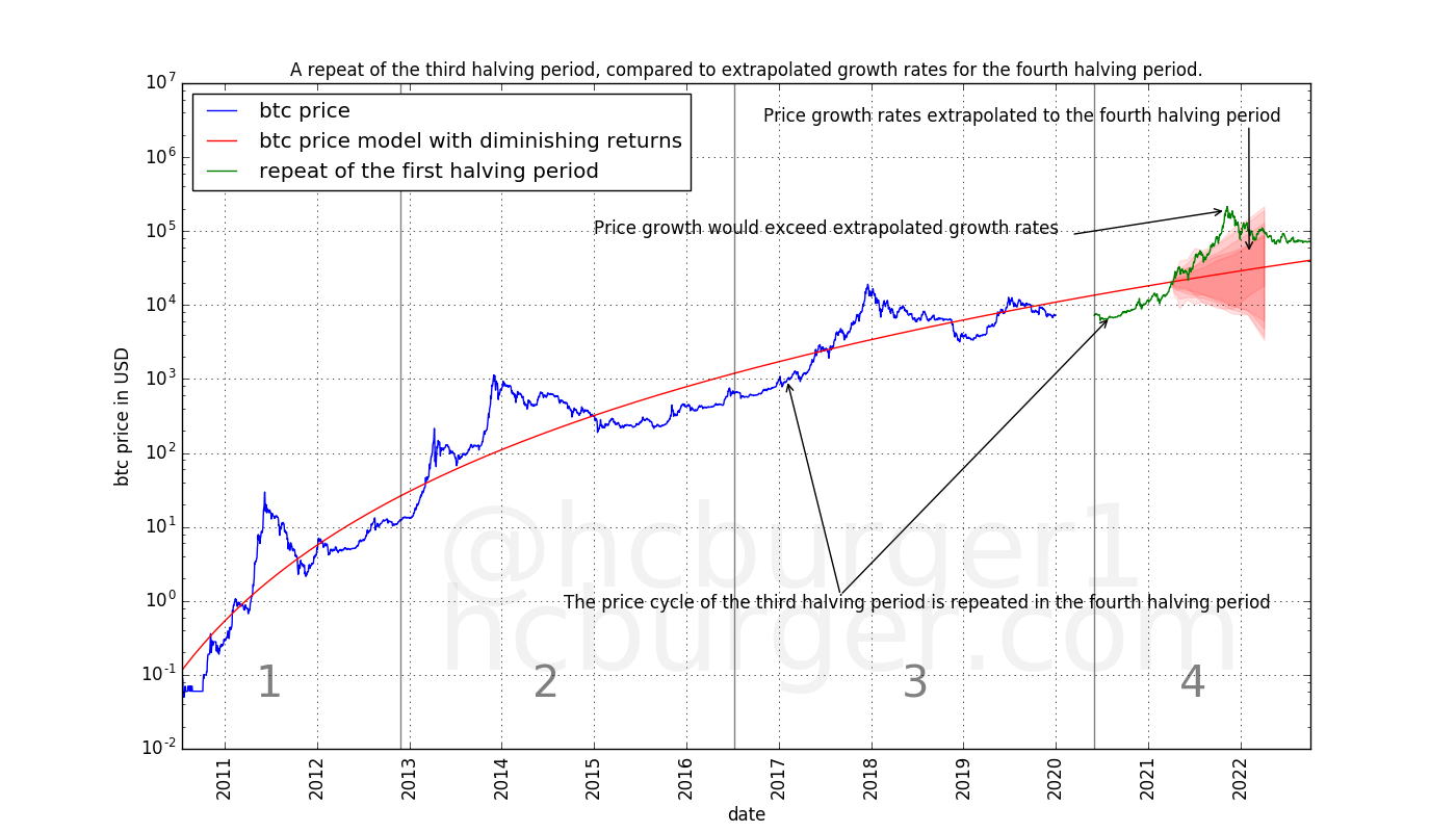 Assuming 0 price growth until the third halving, and using extrapolated statistics for the fourth halving period, we get the following possible price movements.