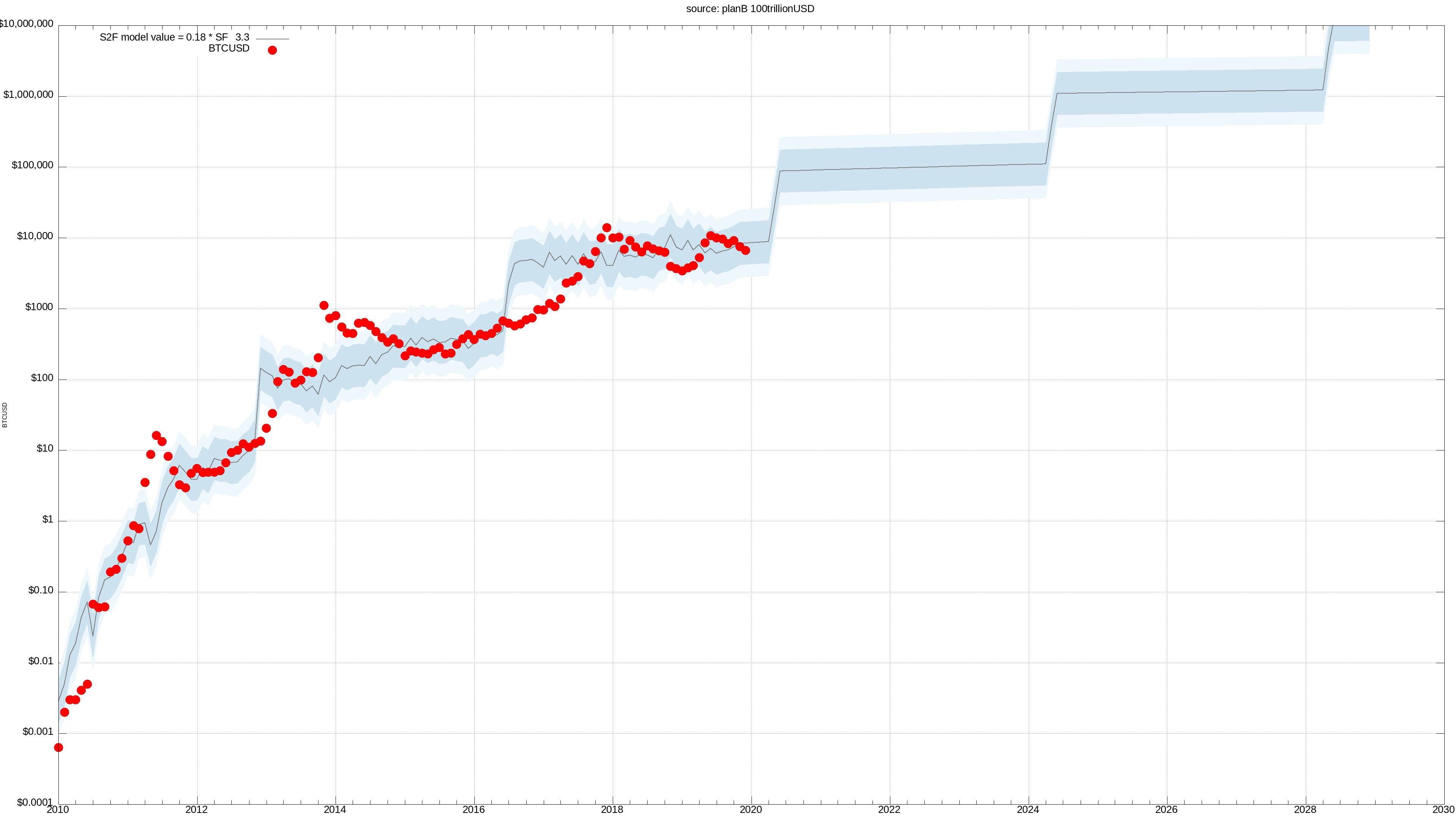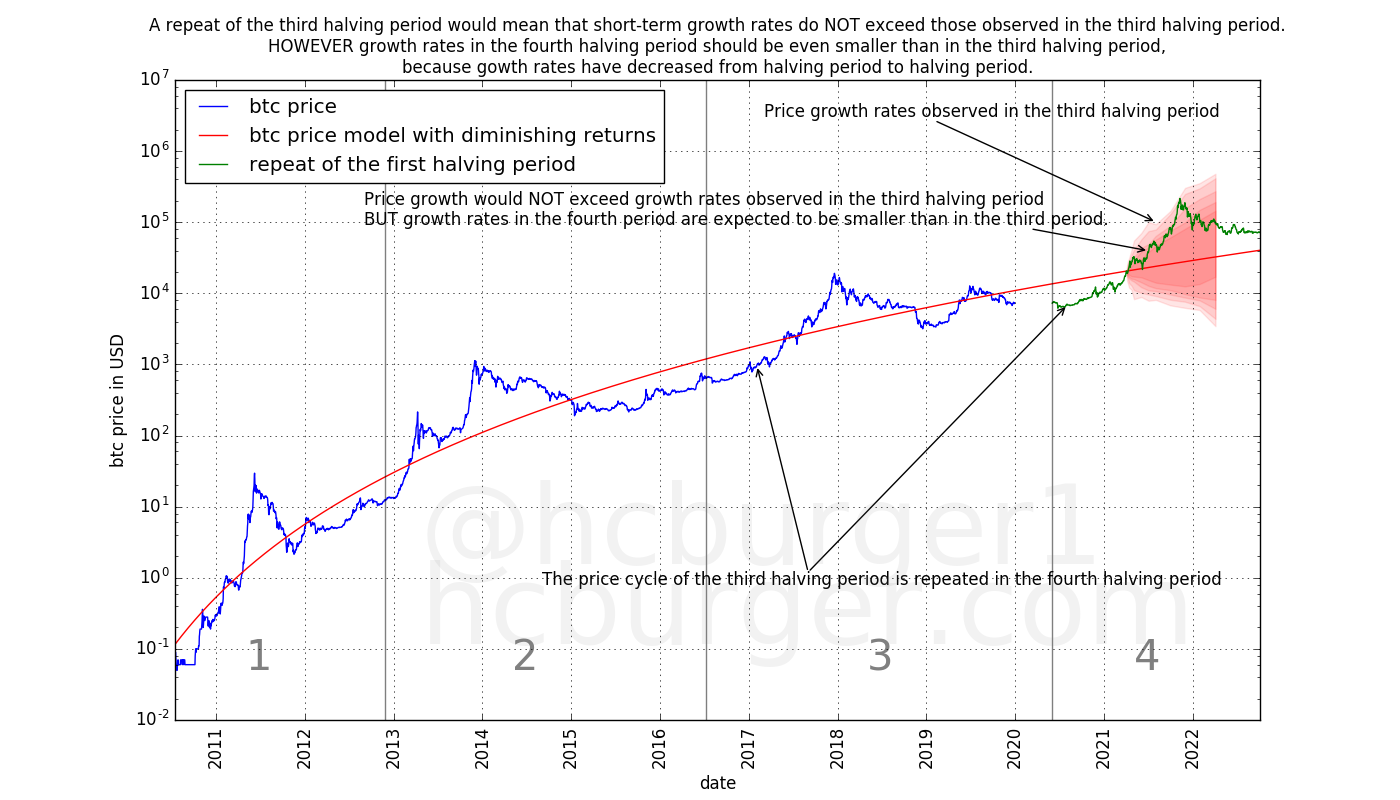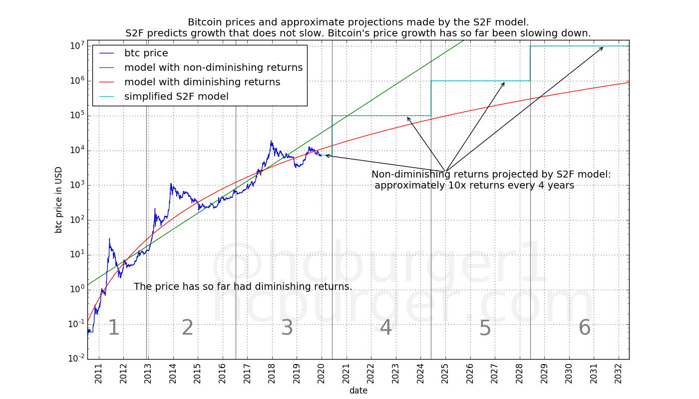 Also, it is not quite correct to say that the S2F model has non-diminishing returns: In the early history, returns as modeled by the S2F model are indeed diminishing. The returns only diminish up to a certain point, though (approximately a 10x return every 4 years).
