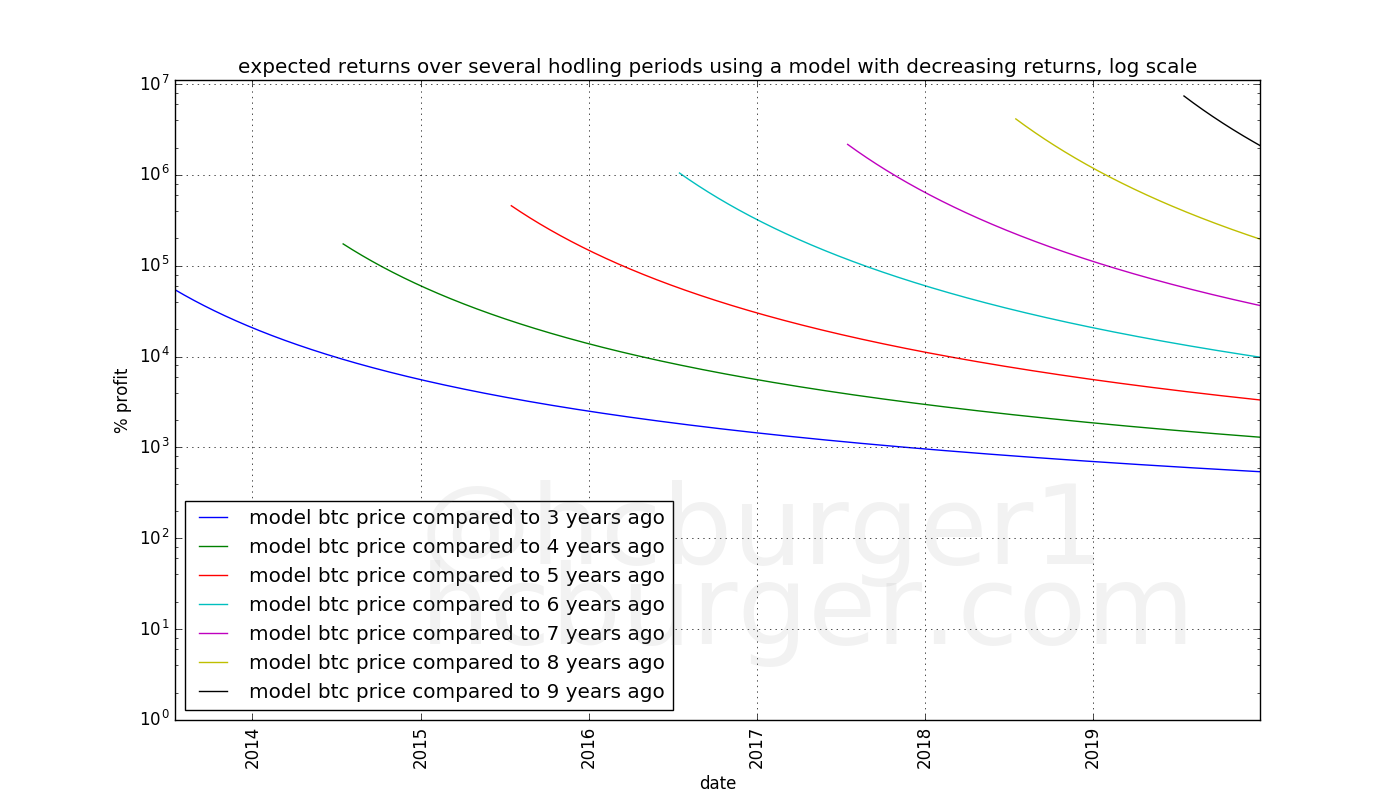 Using a model with diminishing returns, the situation is different: The expected returns depends on when one invested. The lines in the below plot drop sharply, which means that for the same hodling period, buying earlier gives higher expected returns.