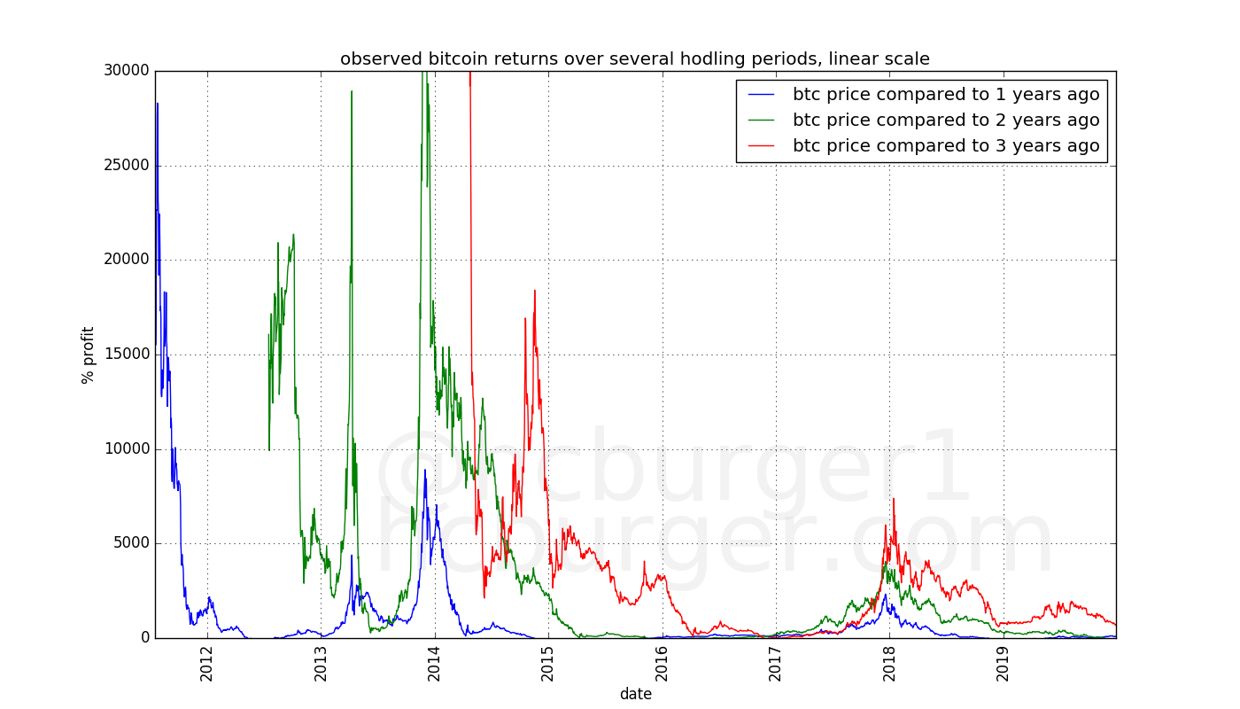 In the semi-log chart, we notice very low returns for the 3-year hodlers around the 2017 mark. This is because the price around 2017 was about $1000, approximately the same as during the previous all-time-high, around 2014. Someone who bought at that all-time-high and sold three years later could have made a small loss.