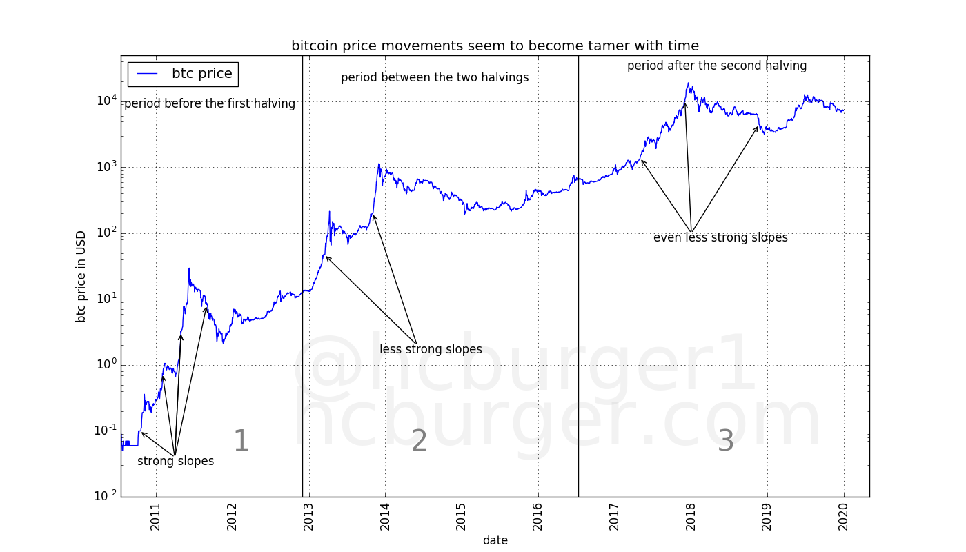 However, short-term price movement statistics should be tamer in the fourth halving period than in the third, for the same reason as statistics in the third period are tamer than in the second period.