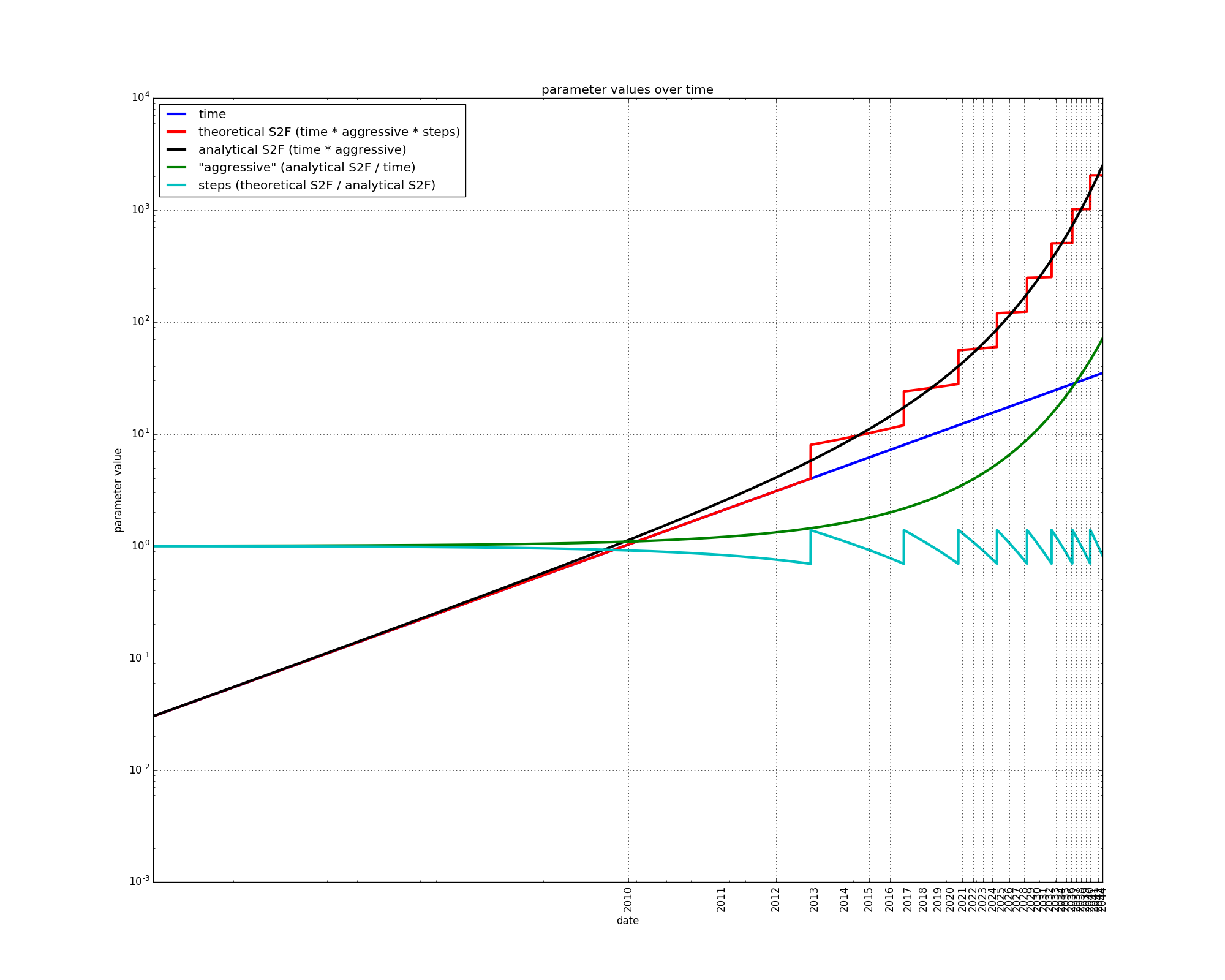 The reason for the shape of the S2F model is due to the presence of an exponential component within the “aggressive” component, which is itself a component of the S2F variable itself. Exponentials are extremely dangerous when used without brakes. Intuitively, exponentials ultimately catch up with any other kind of growth. An exponential with a positive sign leads to non-diminishing growth forever, whereas an exponential with a negative sign leads to an ultimate bitcoin price of 0.