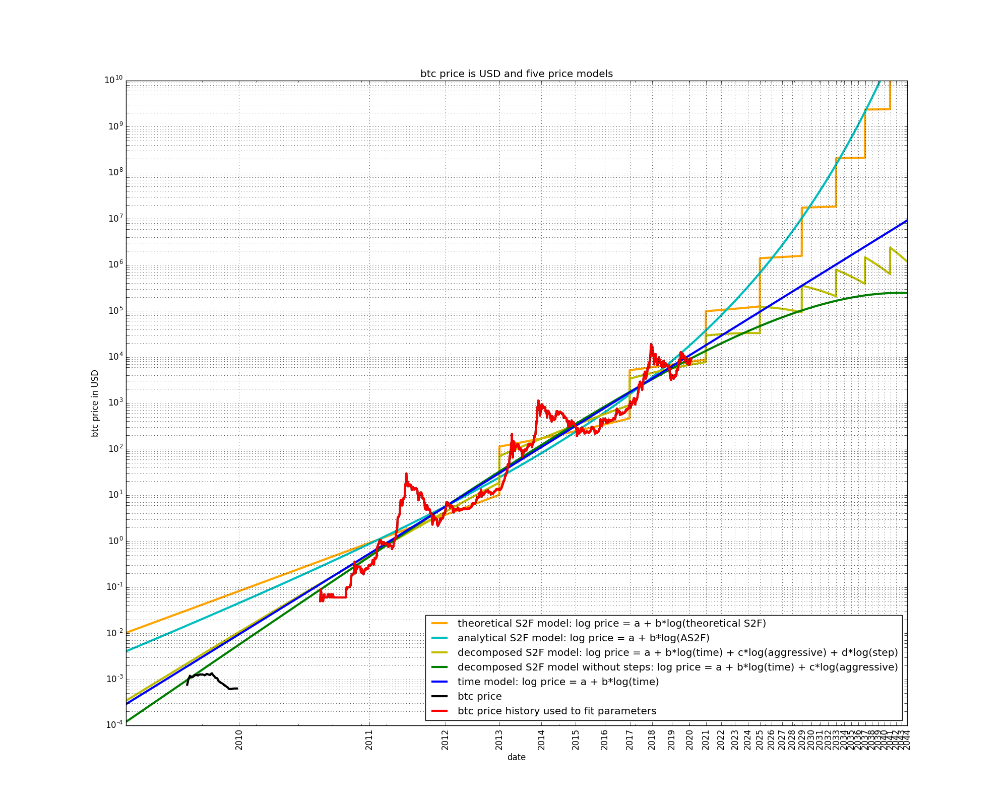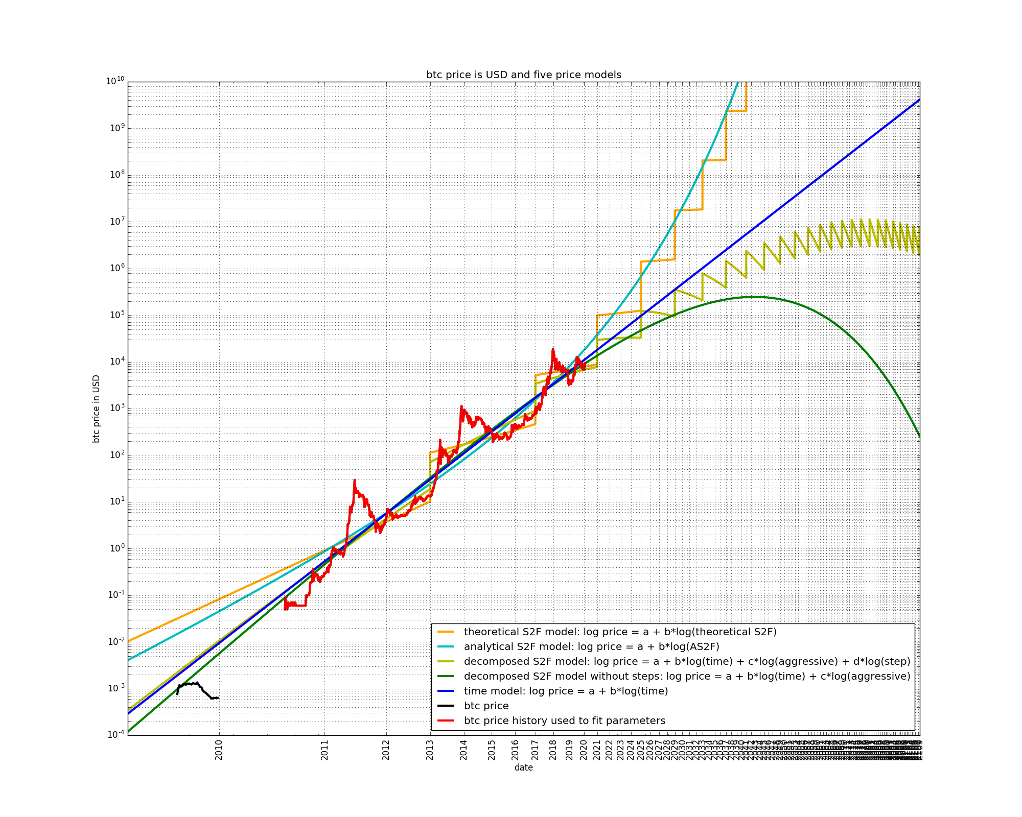 The decomposed S2F models should not be used for actual price forecasts or trading purposes, due to their instability. The decomposed S2F models have more variables, and are therefore more prone to overfitting, a phenomenon we have observed by removing parts of bitcoin’s price history and projecting into the future. The fact that the partially exponential input variable can be weighted independently of the other variables makes the decomposed S2F models more unstable that the plain S2F model, in which the exponential component is coupled with other variables.